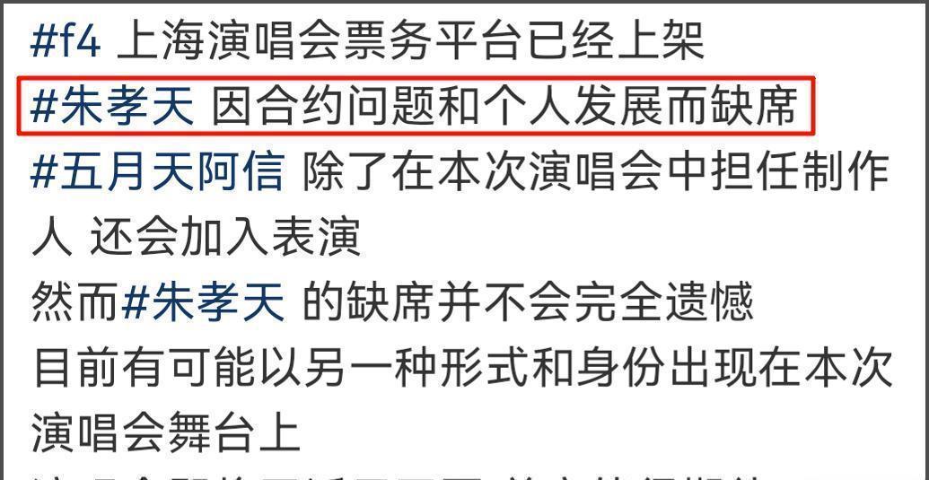 预热了小半年的F4合体演唱会,官宣那一刻直接让网友炸锅,海报上言承旭、吴建豪、周渝民旁边,赫然印着五月天阿信的名字,而原本该在的朱孝天,消失了。