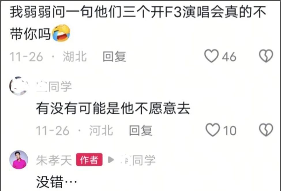 但打脸的是,朱孝天前阵子还积极试唱F4新歌,直播里虽嘴硬说“只把其他三人当同事”,却明显在努力给合体造势。这一波操作下来,反而显得他像是被临时踢出局。