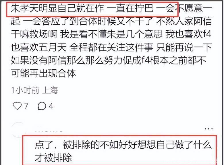 也有网友吐槽朱孝天,说他“团魂”不够。他在直播里直接讲,和其他三位成员其实不怎么熟,这下网友的“回忆滤镜”都有点碎了。大家本来挺期待他们重聚,结果他这么说,感觉是泼冷水。后来有消息说他是被“踢出局”的,他又解释说是自己本来就不想去,给人一种挺矛盾的感觉,显得有点拧巴。